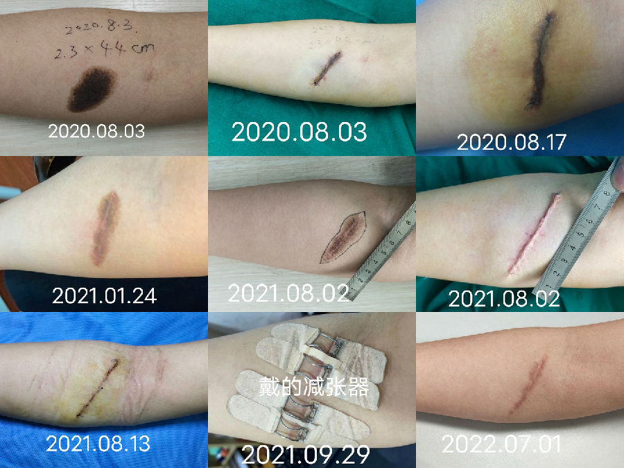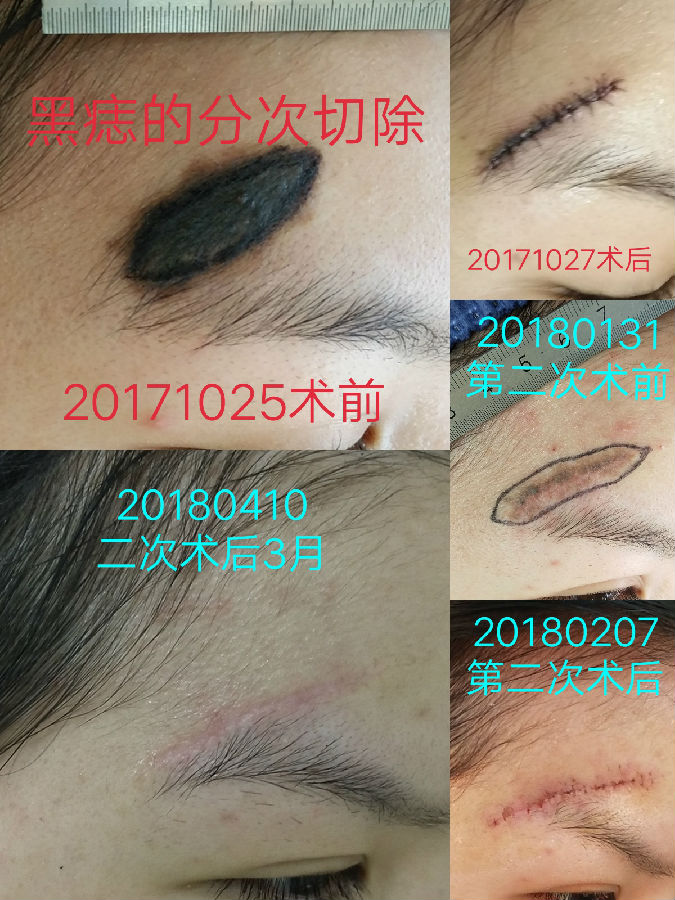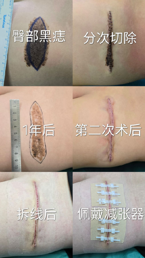 为了最终减轻疤痕,我们常建议进行分次切除,目的是减轻张力,减少猫耳朵,缩短疤痕长度,缺点是增加手术次数,增加治疗费用。案例如下: