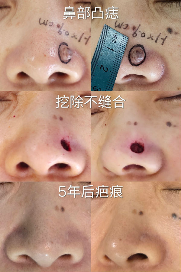 鼻翼部位的手术,考虑到缝合手术会导致变形严重,我们也可以采取只切除不修复的方法,使用生长因子促进创面自行愈合,也可以达到满意的效果。案例如下: