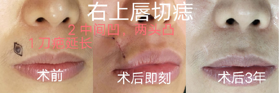 2 术后会呈现疤痕中间凹进去,两头凸出来的外观。(时间久了会好转一些,如图2)