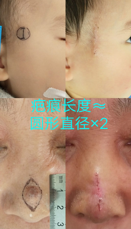 1 术后疤痕约等于直径的2-3倍。(具体受手术部位影响,如图1)