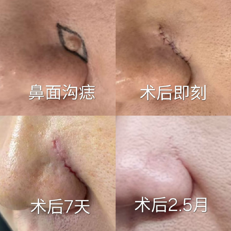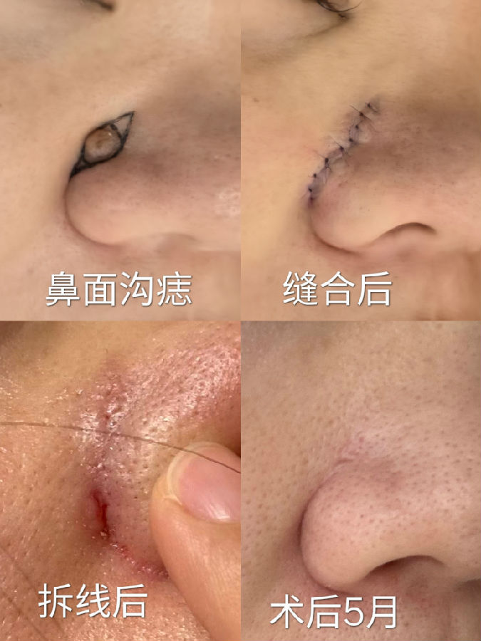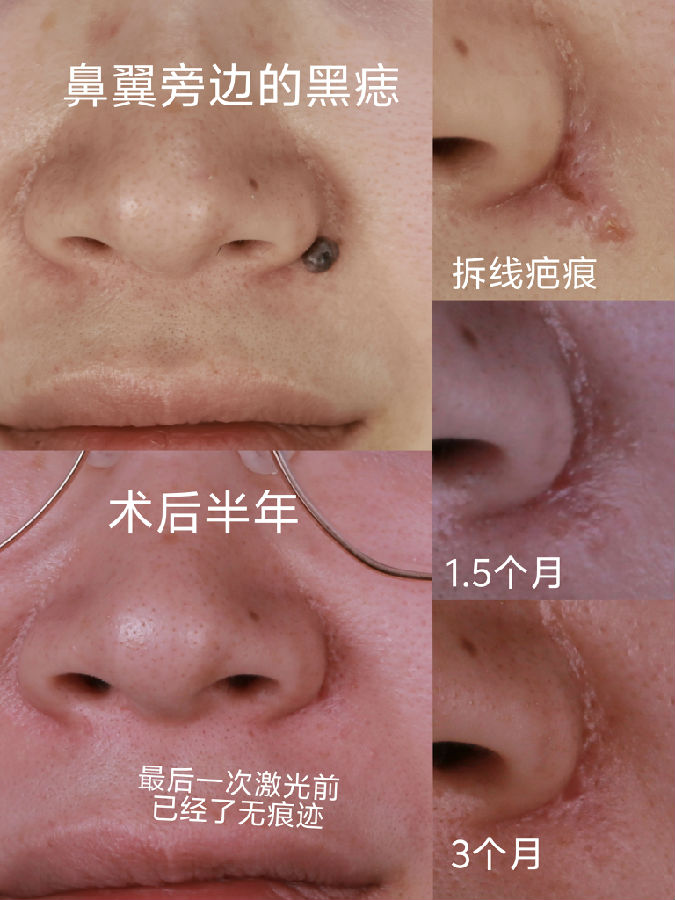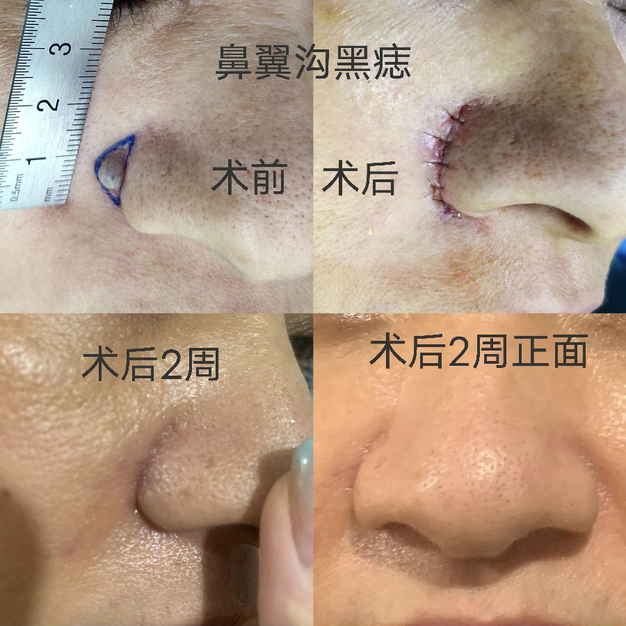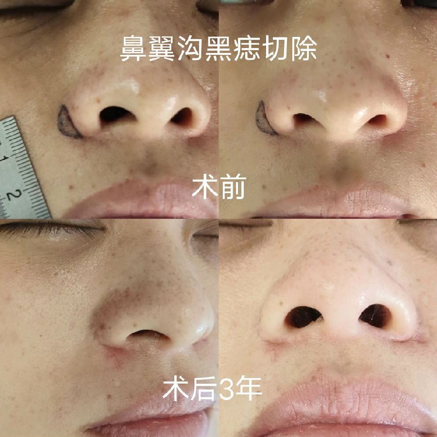 鼻翼沟黑痣切除,因为有天然边界线,所以在较小的时候可以直接将切口设计在沟内,这样疤痕非常隐蔽,避免黑痣长大后无法或者很难将刀疤隐藏。需要注意的是,即使术后鼻翼轻微外扩和沟变浅,也比原来凸起的黑痣美观、健康。