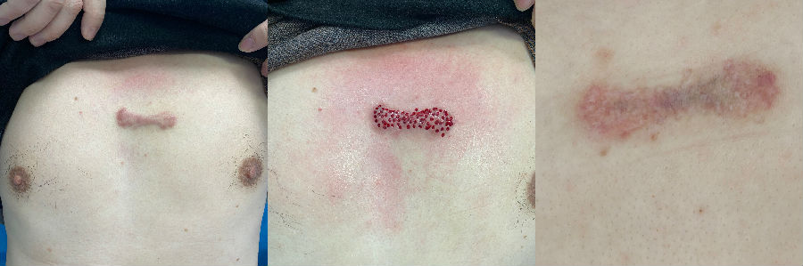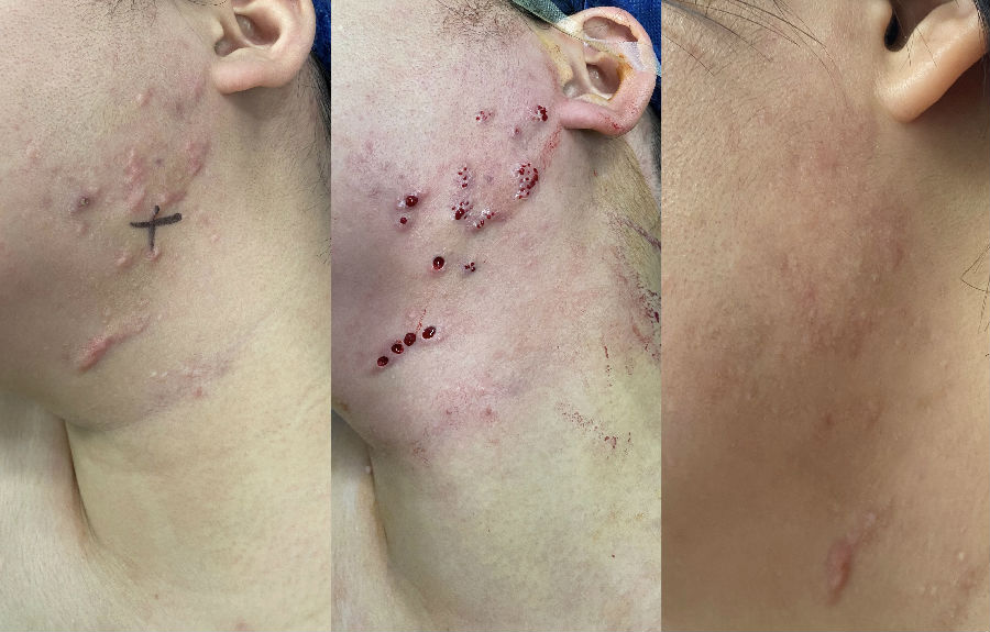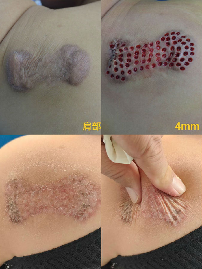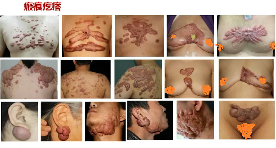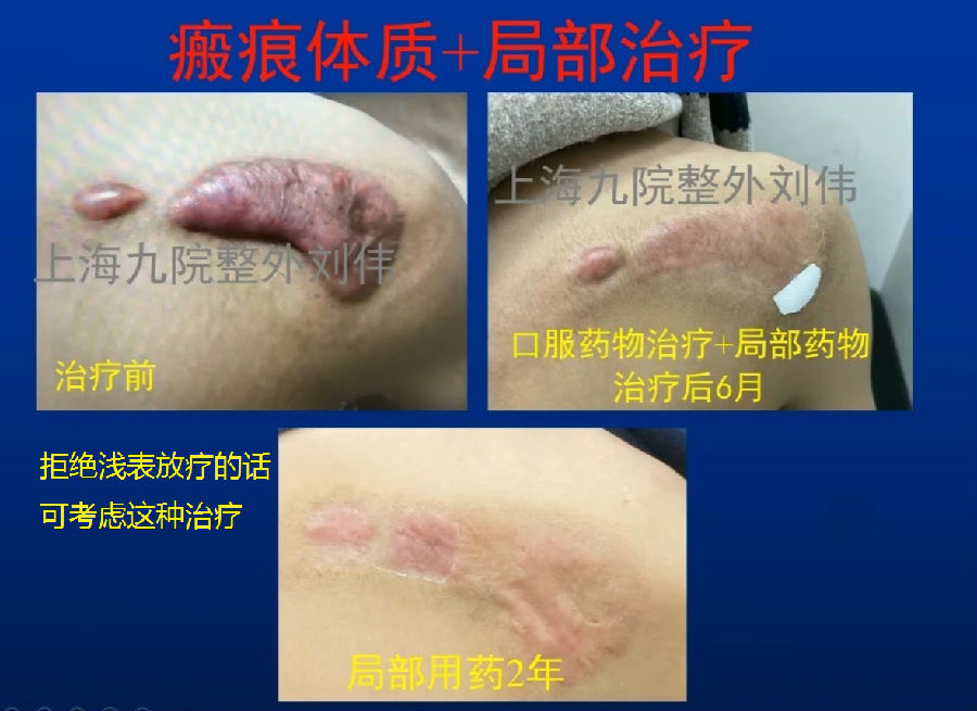 2局部的单处的瘢痕疙瘩,可以通过手术切除,减张缝合,外减张器应用,加浅放治疗,获得较低的复发率。但对全身多发的瘢痕疙瘩,仍然是治疗难题。