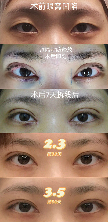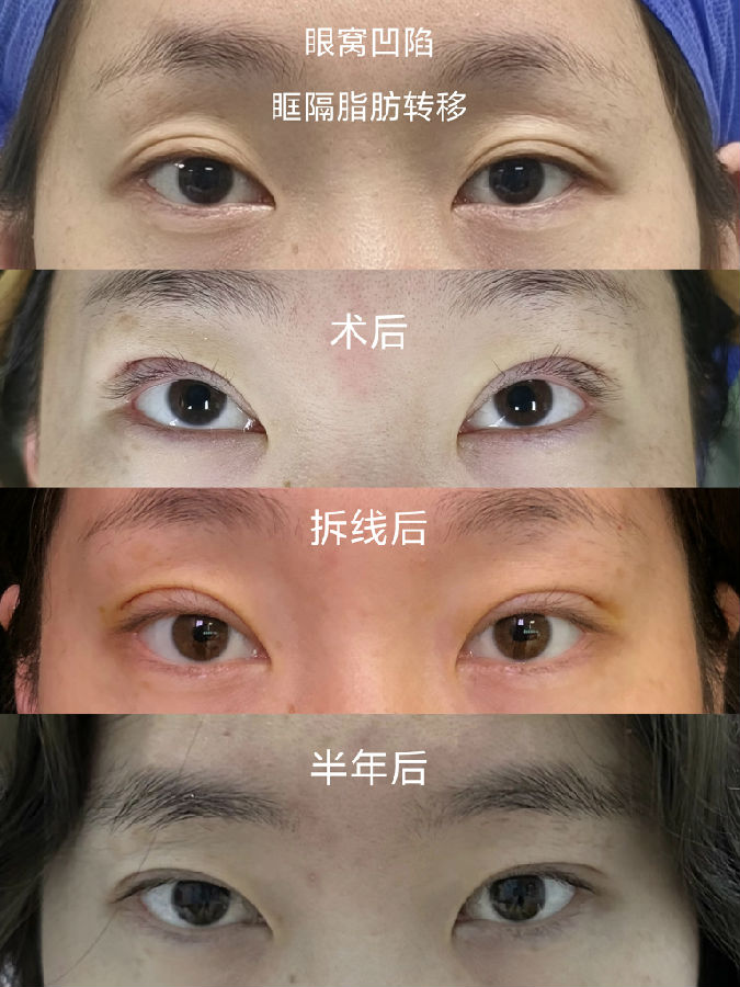 所以,经常会告知:双眼皮手术后,如果逐渐出现严重眼窝凹陷或三眼皮的话,需要做自体脂肪移植填充眼窝凹陷的手术。(希望各位一辈子不会需要。)