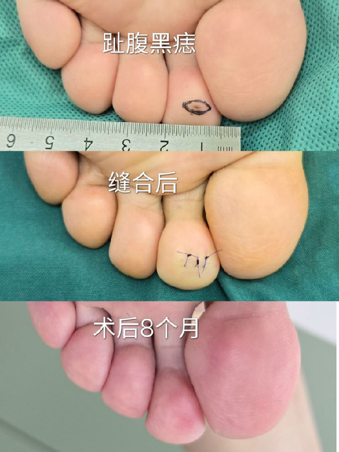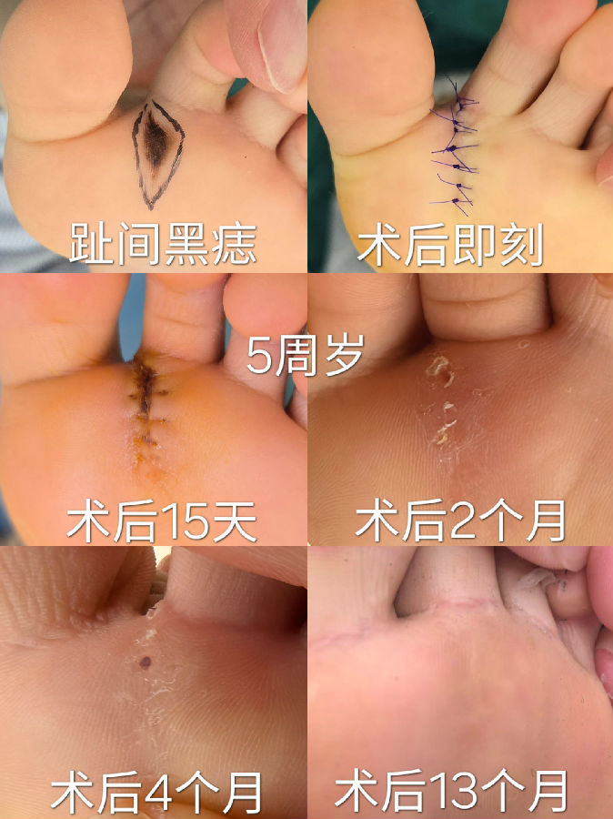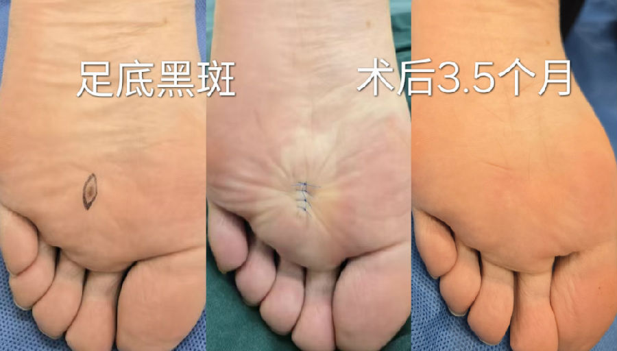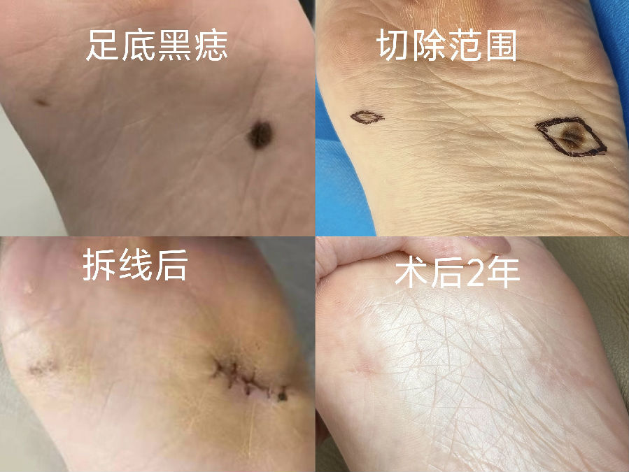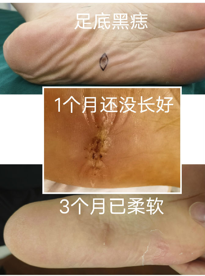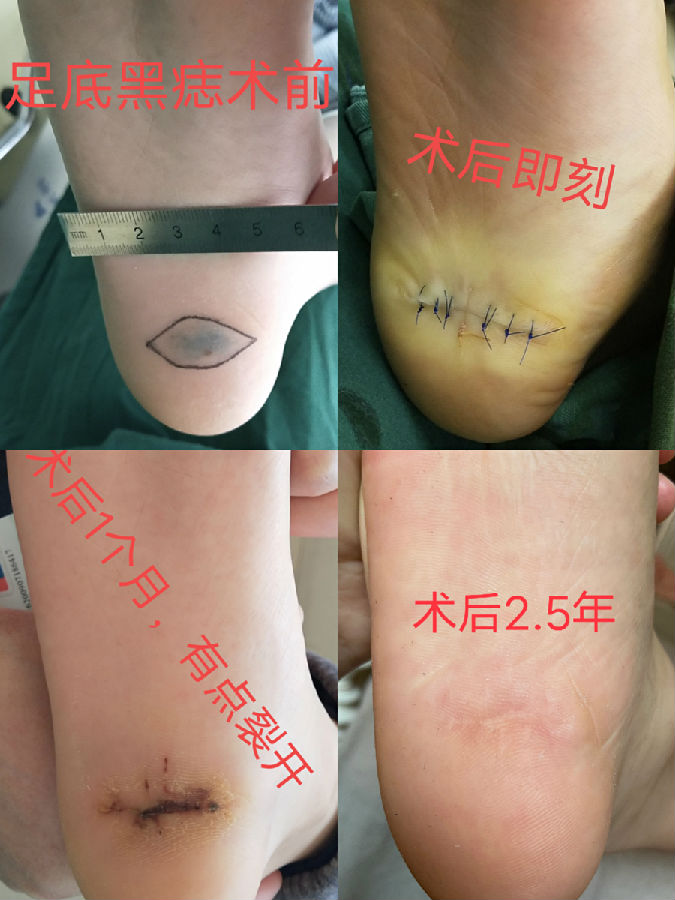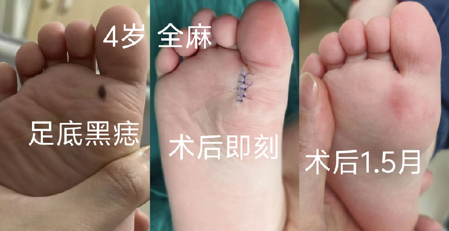 足底黑痣黑斑,建议更加积极的扩大手术切除,幼儿全麻,大人局麻。