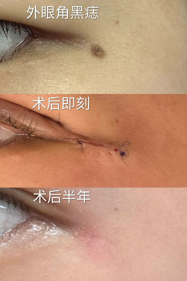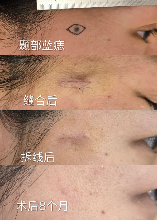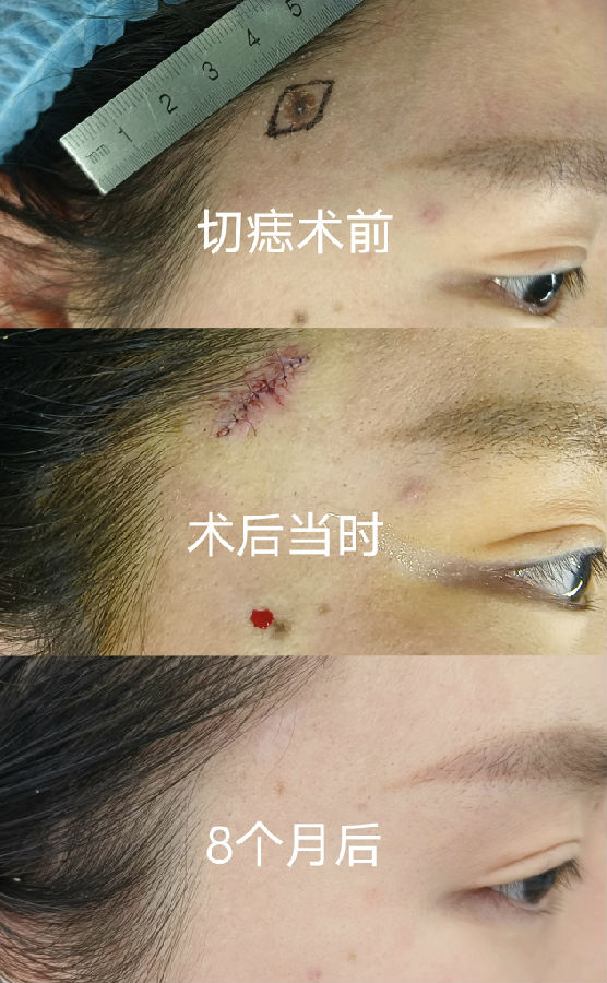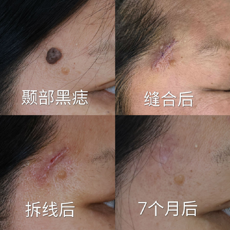 侧面部的瘢痕往往不在高光处,非常隐蔽,因此,太阳穴和鱼尾纹黑痣建议可以积极切除。