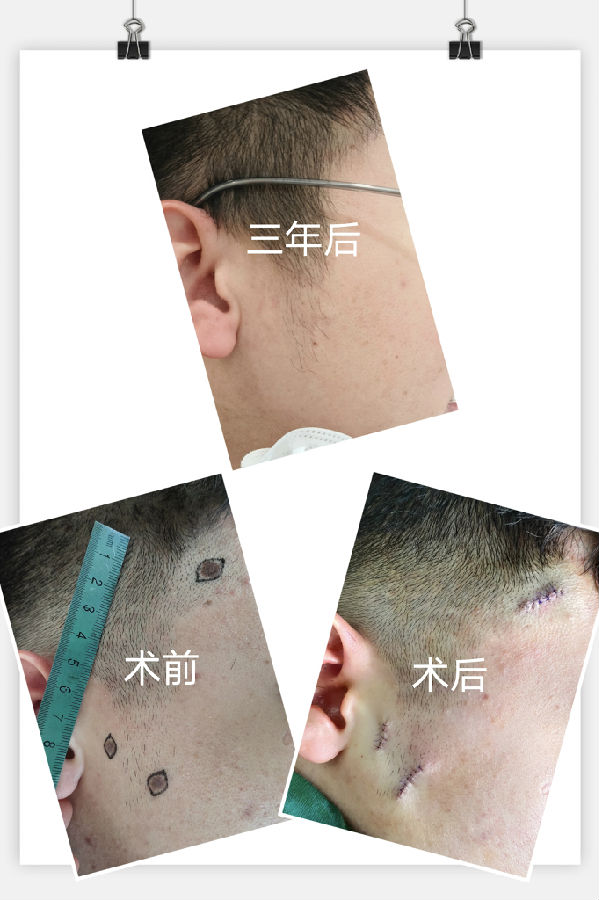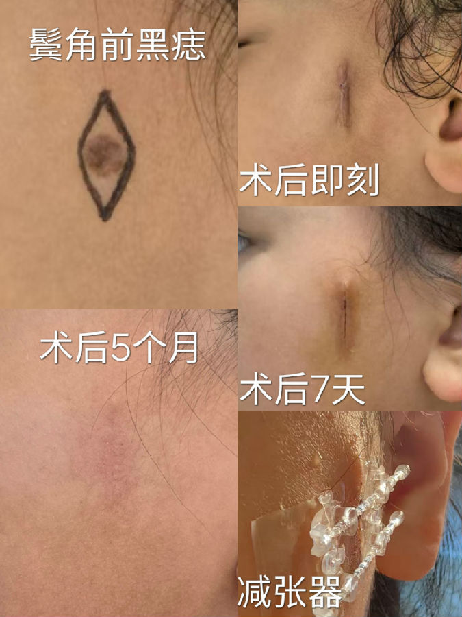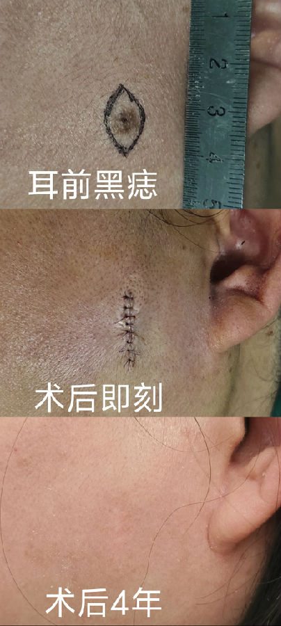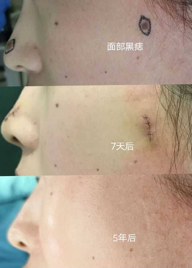 面部的侧方,在耳前和鬓角周围的黑痣,当需要手术切除的时候,建议更积极主动一些,因为这个区域即隐蔽、术后疤痕又往往比较淡。