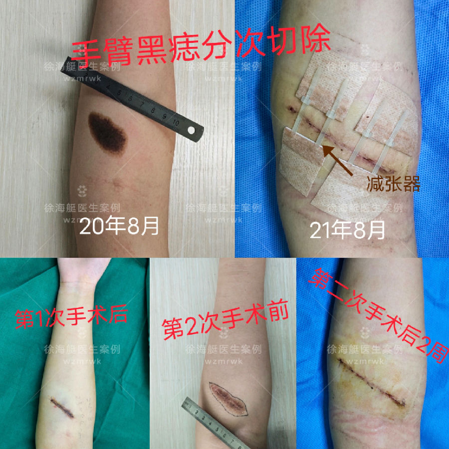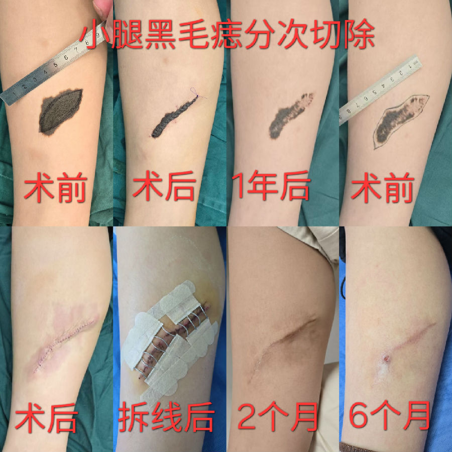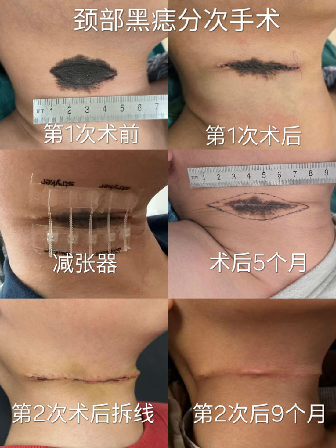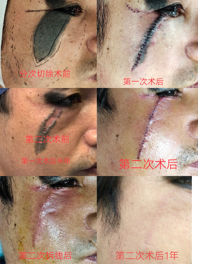 为了最终减轻疤痕,我们常建议进行分次切除,目的是减轻张力,减少猫耳朵,缩短疤痕长度,缺点是增加手术次数,增加治疗费用。案例如下: