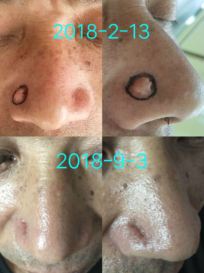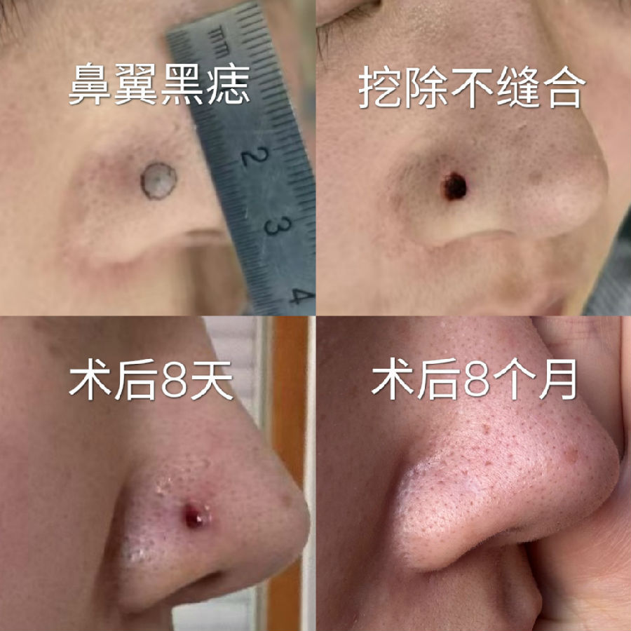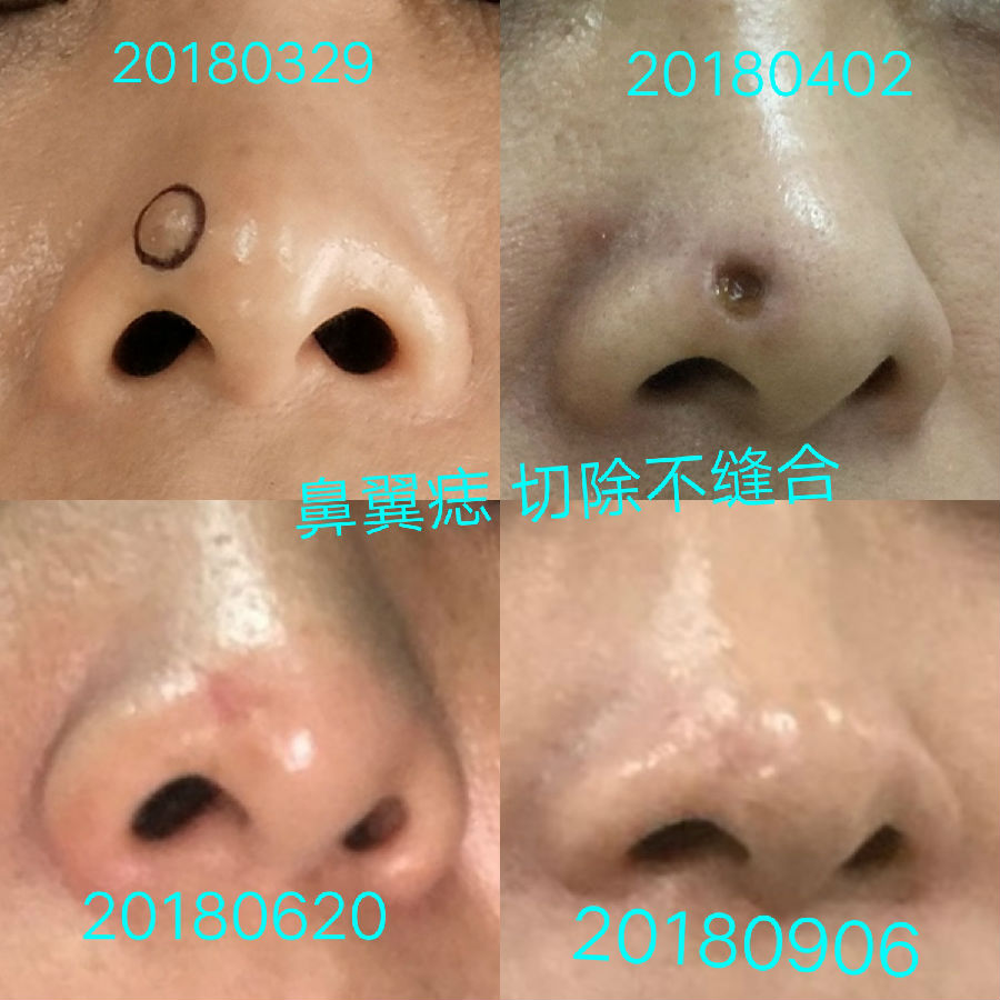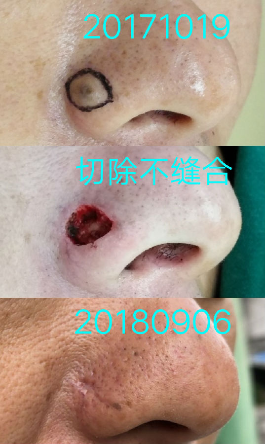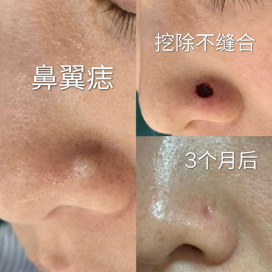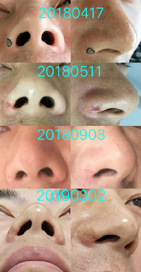 鼻翼部位的手术,考虑到缝合手术会导致变形严重,我们也可以采取只切除不修复的方法,使用生长因子促进创面自行愈合,也可以达到满意的效果。案例如下: