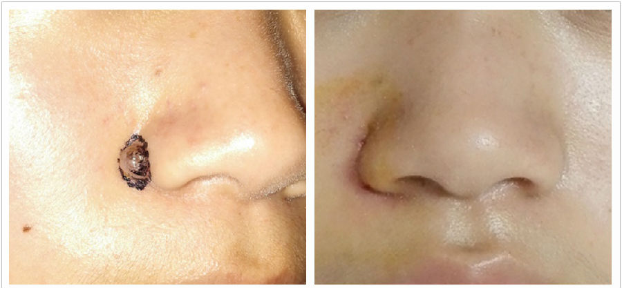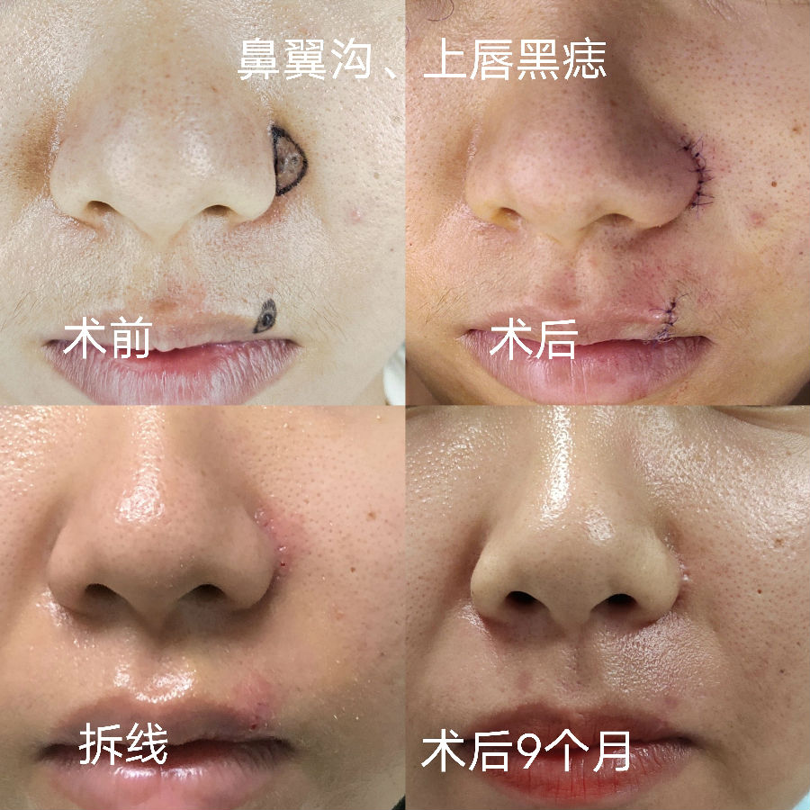 鼻翼沟黑痣切除,因为有天然边界线,所以在较小的时候可以直接将切口设计在沟内,这样疤痕非常隐蔽,避免黑痣长大后无法或者很难将刀疤隐藏。需要注意的是,即使术后鼻翼轻微外扩和沟变浅,也比原来凸起的黑痣美观、健康。