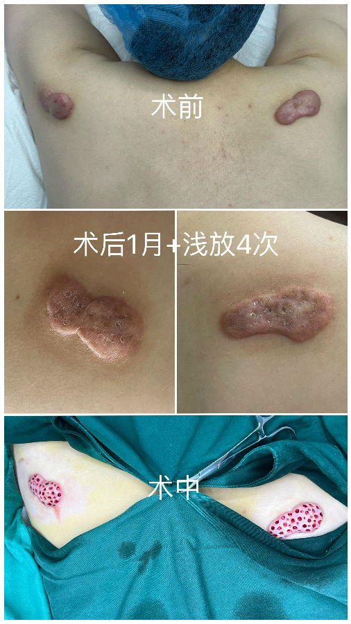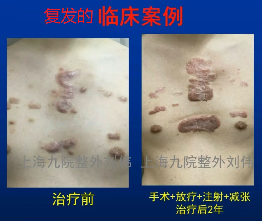 2局部的单处的瘢痕疙瘩,可以通过手术切除,减张缝合,外减张器应用,加浅放治疗,获得较低的复发率。但对全身多发的瘢痕疙瘩,仍然是治疗难题。