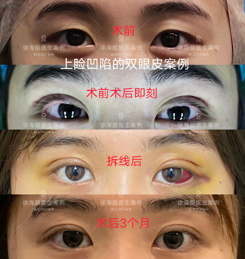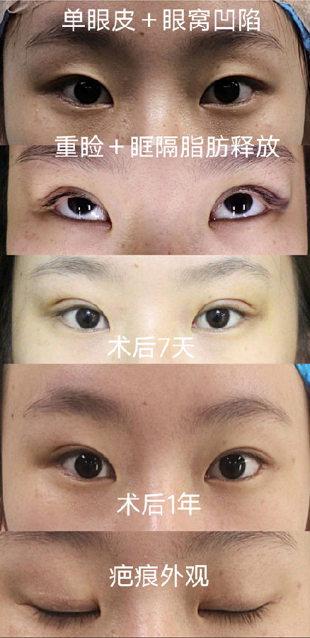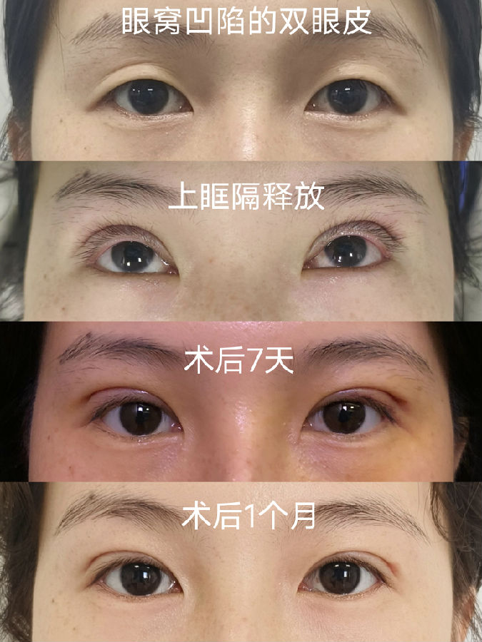 这种情况会伴随着2个问题:1需要做眶隔脂肪释放或者称将眶隔内的眼球后脂肪挪到前方来,目的是即纠正凹陷、又避免异常黏连导致的三眼皮,2即使如此预防,也会仍旧存在凹陷、变成三眼皮的概率比别人高。