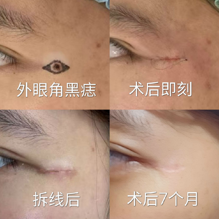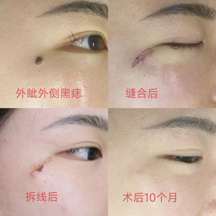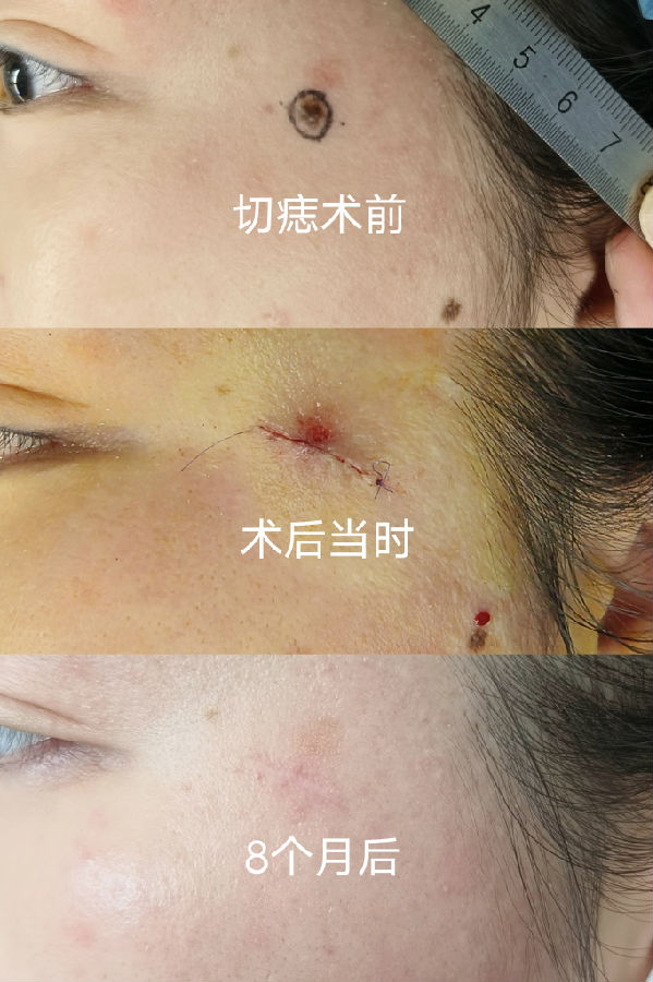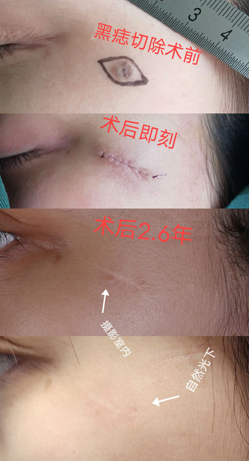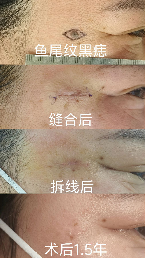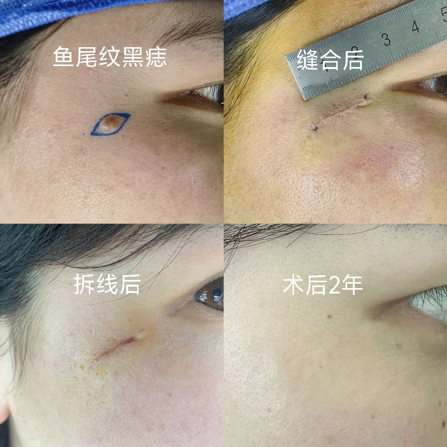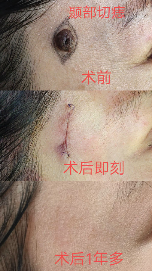 侧面部的瘢痕往往不在高光处,非常隐蔽,因此,太阳穴和鱼尾纹黑痣建议可以积极切除。