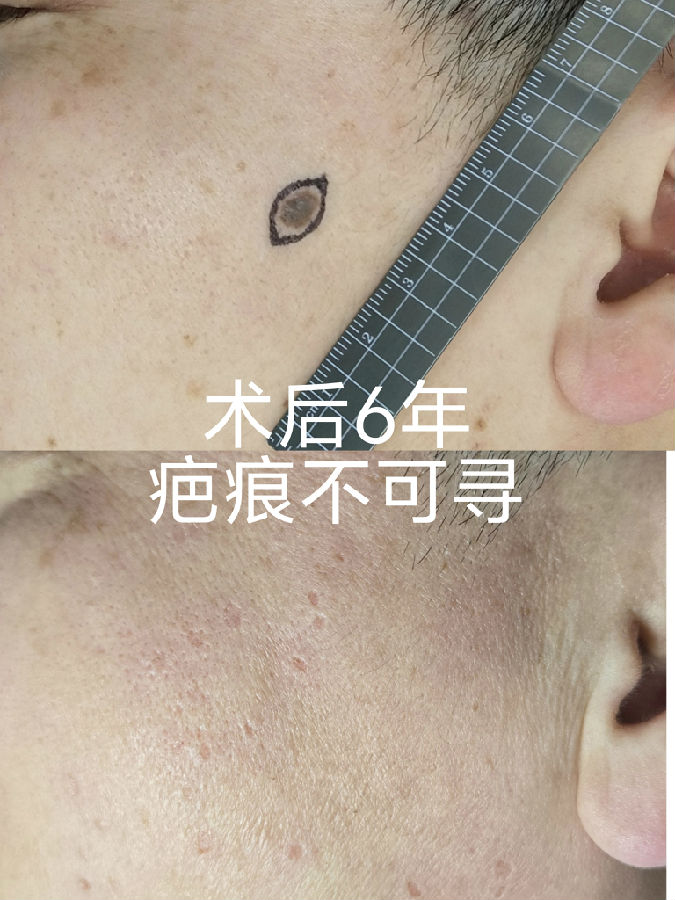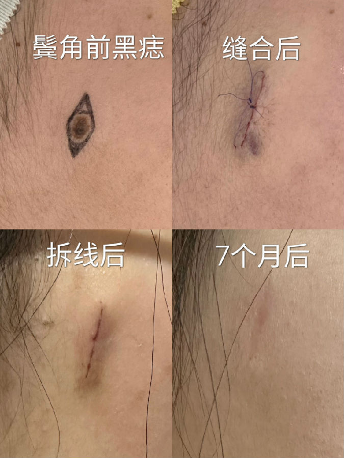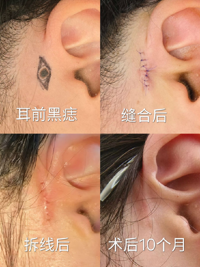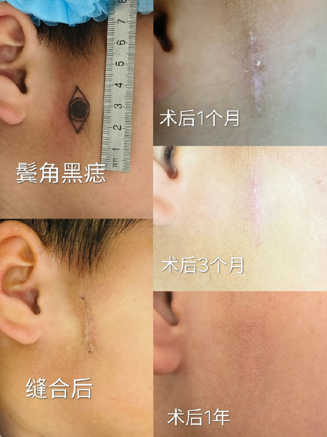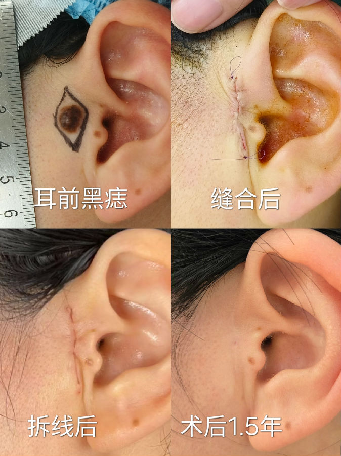 面部的侧方,在耳前和鬓角周围的黑痣,当需要手术切除的时候,建议更积极主动一些,因为这个区域即隐蔽、术后疤痕又往往比较淡。